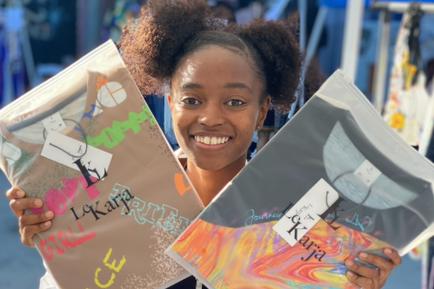 Le Karja is named for her mother, Karja, a Jamaican who also attended (FIT). “I design for a new generation of young people who identify with both cultures and aren’t afraid to express that. My designs are bold, headstrong, and beautiful just like my customers,” said Donaldson, who was born in New York. “I connect with my shoppers through Instagram @Lekarja, Facebook, Twitter, and tik tok. Technology and social media have been the key to my success and as a Gen Zer, I wouldn’t have it any other way.”