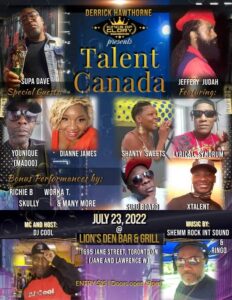 Reggae supporters in Toronto can go and see several artists appearing on Derrick Hawthorne, Kings of Glory Entertainment presentation ‘Talent Canada’. The show will take place at the Lion’s Den Bar and Grill, 1695 Jane Street on Saturday, July 23rd, 2022 Appearing live on stage are Dianne James, Younique, Shanty Sweets, Jeffrey Judah, Suru Board and more talented reggae artists. M.C will be Deejay Kool and doors open at 9 PM.