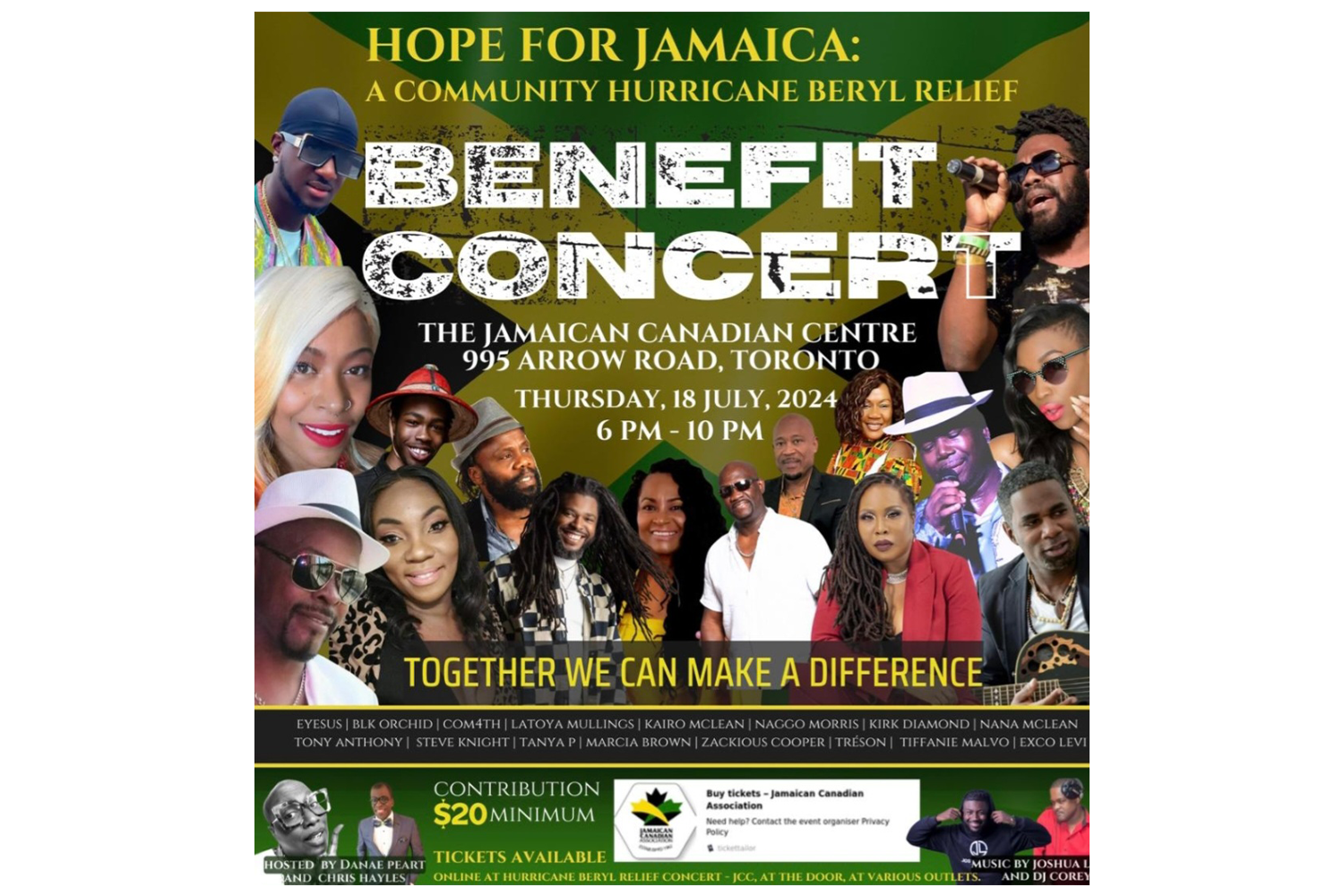 Tickets: Minimum contribution of $20, available for purchase online at Buy tickets – Hurricane Beryl Relief Concert – Jamaican Canadian Centre (tickettailor.com). Tickets are also available for purchase at Caribbean Queen Jerk Drum Restaurants at 3408 Weston Road, 14 Bradstock Road and 2079 Lawerence Ave West. Tickets will be available at the door for purchase.